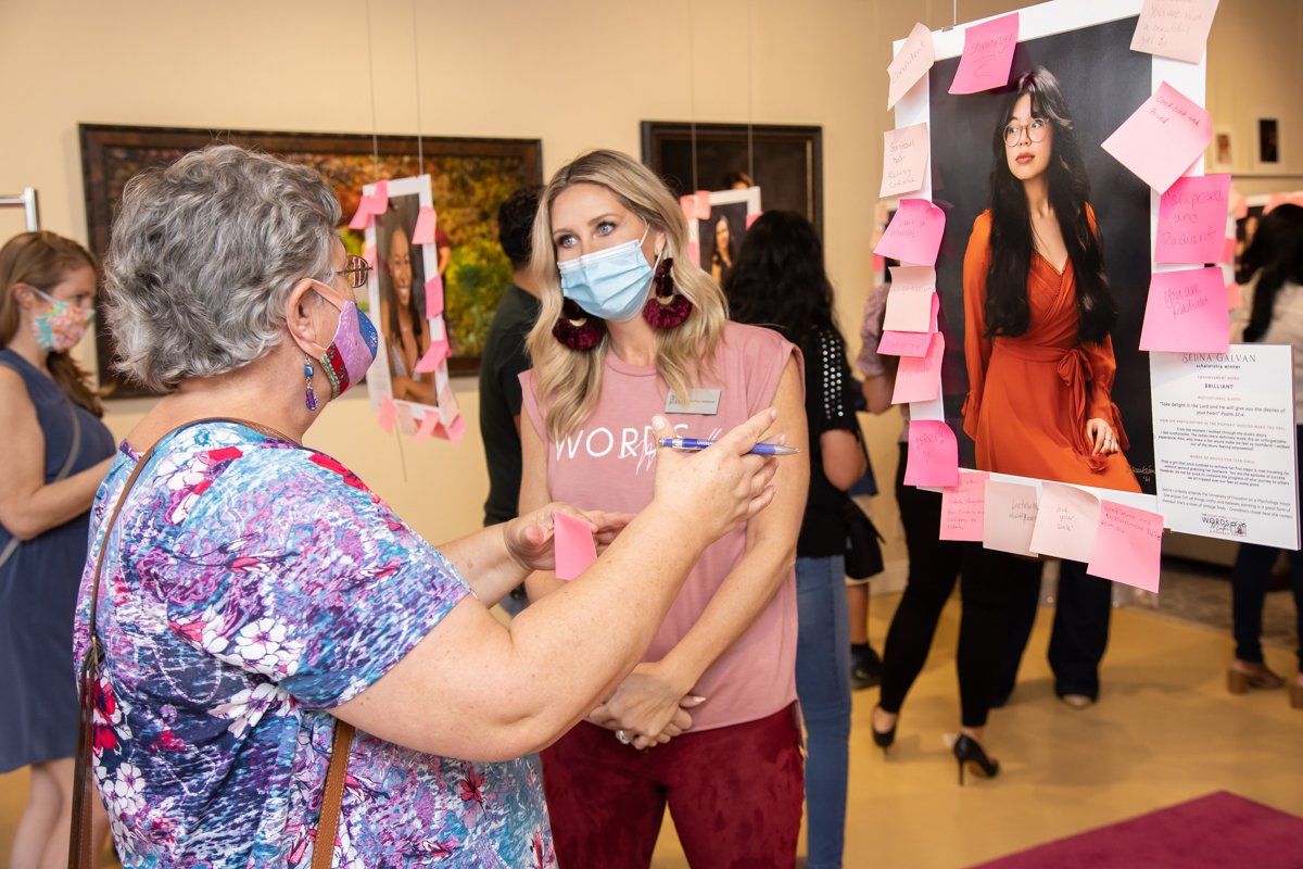 As people began to come, I enjoyed having conversations with them about self-esteem, and our main belief that words matter. The interactive exhibit allowed those who attended to write positive messages to the participants on sticky notes and leave it for them to keep forever. This practice was life-giving and a welcome respite from the usual negativity we face in the world today. Most of the attendees agreed that the words they say to themselves and others truly do matter, and they appreciated the reminder. The gold, however, was found when I came across someone who understood how important it was to be open to complimenting themselves just like they were complimenting the strangers in the hanging portraits. They were open to improving, to learning and listening alongside their daughters, and were willing to try making that day