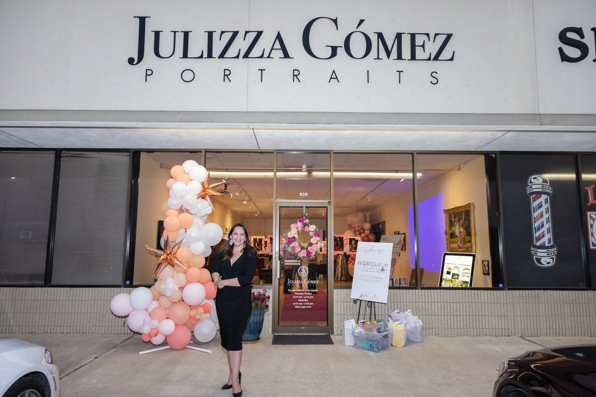 In preparation for the exhibit, the studio got a major renovation. We installed new ceiling tiles, a new ceiling-mounted projector (my old one was done), and replaced my flowers among many other things. I stored most of my studio clutter elsewhere to make it look as much like a museum exhibit as was possible. I ordered artwork and frames for the walls, and hardware to hang the portraits from the ceiling. It looked GREAT in there! GGF had a balloon column donated by Bon Bon Events, and another balloon arch from Lauren Alvarado, and we set up some easels outside to make it inviting. This exhibit was such a success due to The GGF and their connections!